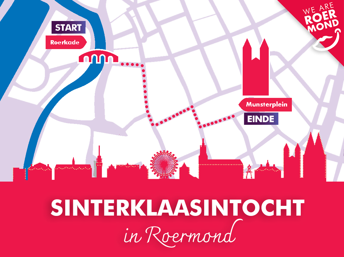 De Sint komt zondag met zijn stoomboot aan bij de Roerkade. Vanuit hier gaat hij in een bonte optocht compleet met Pietenfanfare door het centrum van Roermond (via de Brugstraat, Neerstraat en Paredisstraat) op weg naar het Munsterplein.
